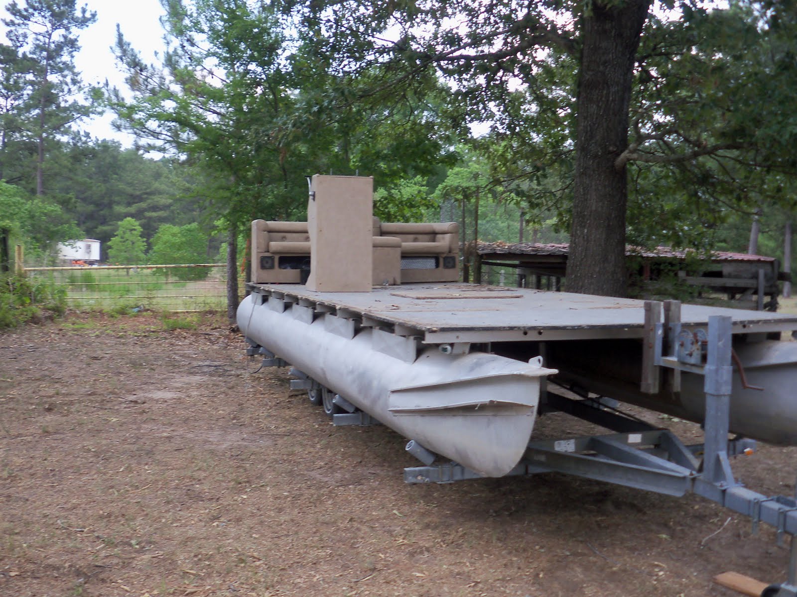I guess you could say that the search for Semper Fi started years ago. In fact, probably the first time that I attempted to put myself, Lance and 5 kids on an 18' bass boat. Guess you figured out that never happened. But, after a couple of trips to our local Bass Pro Shop and a flip through a SunTracker catalog and big dollar signs were just staring us in the face. We just figured that it was never to be. Well, never say never. Out of the blue, my brother called and said that he met a gentleman at an anniversary party that was interested in selling his pontoon. He was asking $2,500.00. First question that came up with that kind of price tag, "does it have a motor"? LOL! Well, her deck was soft, the seats were old and worn, the console was outdated but, her pontoons were solid and her engine had been well maintained. We took her out for a spin. She handled like a champ (watch that soft spot there on deck or you'll be swimming to the dock!). She even towed in a couple of jet skiers that were stranded in the middle of the lake. We negotiated what we thought was a fair price and almost fell over when we were told that the trailer came with her! SOLD! We took her to K.C.'s property to have plenty of room for the renovation project now at hand. Welcome Home my lady....Welcome Home Semper Fi!