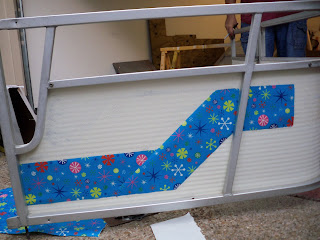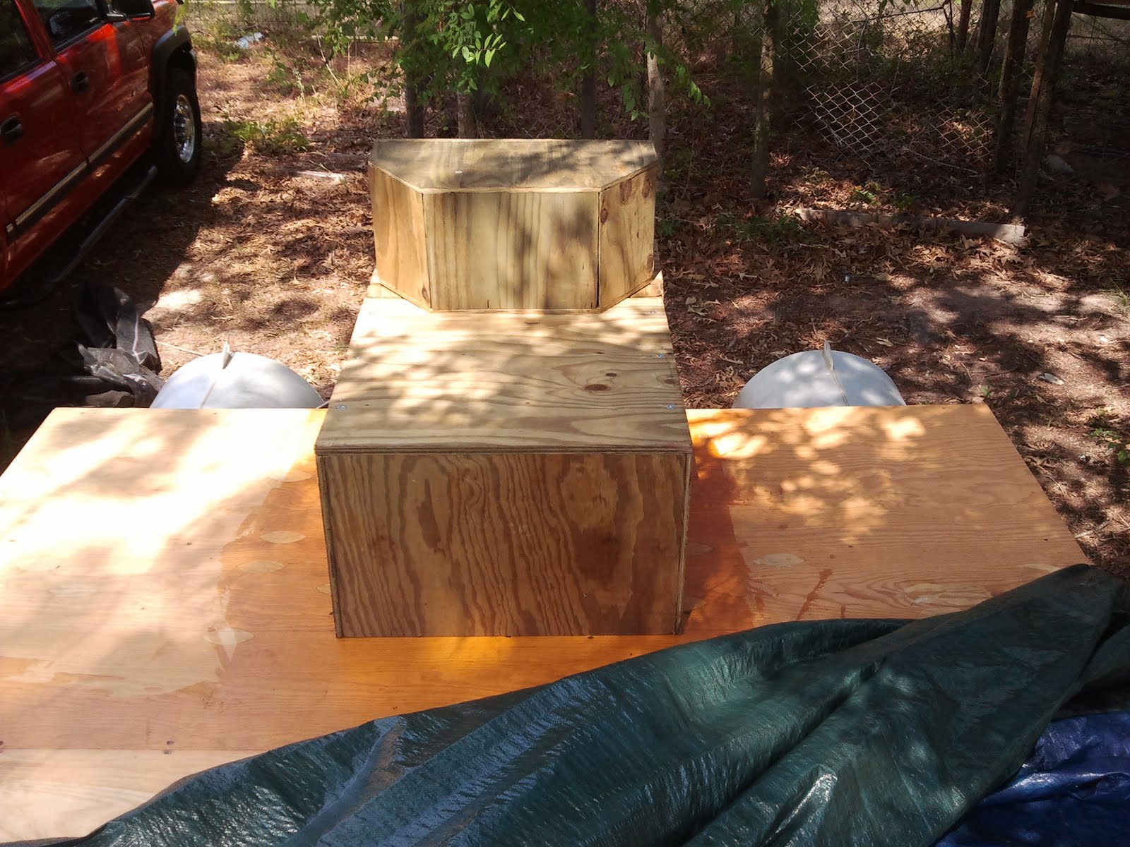 What a day! We are working at Leaflet today. We did a lot of manual labor removing all of the 27 year old decals from the aluminum panels on the railings. The decals are toough to remove but we are having the best luck with the 3M Wood Grain and Stripe Remover. It leaves some adhesive resideue which we will need to remove but is better than anything we have found so far to use. Lots of elbow grease and my elbows have had it! :) Also, we worked on building the engine cover. The engine cover doubles as a seat and a drink holder. It doesn't look like much now, but it will be covered in vinyl and be the focus on the bow of Semper Fi. We stopped by to get a quote to have the engine cover upholstered at a place in Conroe. They were reasonable but we will be gatherine more quotes on Tuesday. We will be spending tomorrow, July 4th, with the family at KC's so we might be taking the cover to see how it fits! Onward and upward!!!